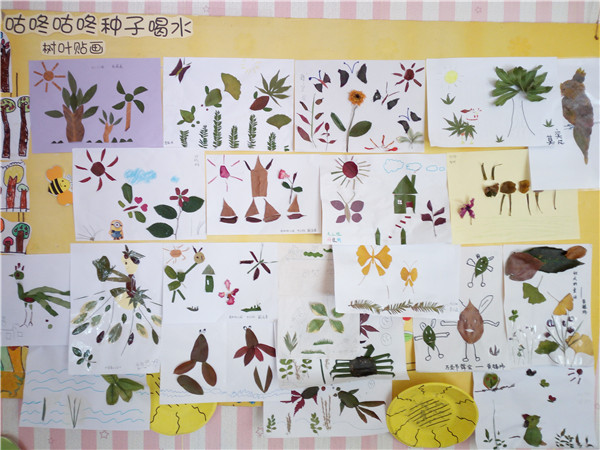 在操作之前,先让孩子欣赏了几幅成品的树叶贴画作品,一方面为了让孩子感知贴画的步骤过程,更重要的是引起孩子们创作的兴趣。交代完要求后,孩子们就投入到了愉快的创作过程中。不一会儿,一幅幅富有童趣的树叶贴画作品就完成了。