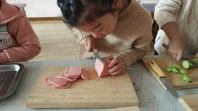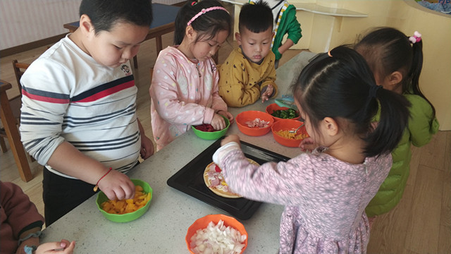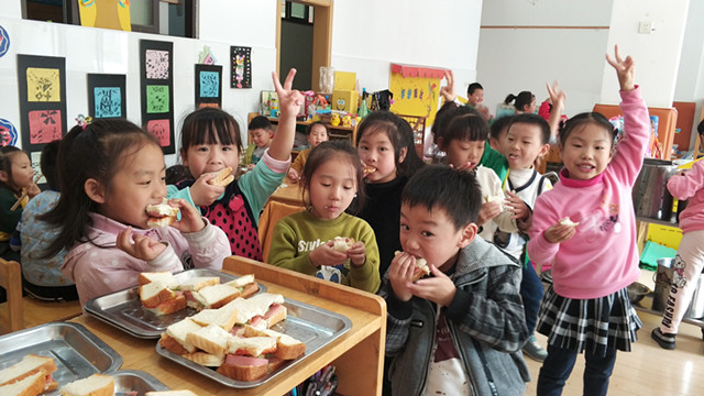 为了让孩子体会到自制美食的快乐,感受食物的来之不易,近期新城逸境幼儿园大三班为孩子开设了为期一周的“我是小厨神”活动。老师和孩子们一起制定了一周“菜谱”,有创意水果拼盘,有最爱的营养三明治,还有高大上的披萨等。孩子们撸起袖子说干就干,孩子们熟练地将黄瓜、吐司面包和方腿肉等分切块,将番茄酱和沙拉酱分别涂在面包两边,然后中间夹好黄瓜片和方腿肉,瞧,迷你版的三明治就做好啦!Pizza是孩子们的最爱,在老师的带领下,孩子们先将各种彩椒和洋葱切成小块,有的先在披萨饼底刷上一层披萨酱,接着帮忙撒上切好的彩椒丁和玉米粒,最后再撒上芝士,“看着好好吃的样子啊!”“我们都好棒啊,会做披萨了。”不时传来孩子在相互耳语。“这个三明治是我吃过最好吃的。”“哇!跟我在外面吃的披萨一样好吃!” 每次孩子们制作了好吃的美食都会拿到教室里和其他好朋友一起分享呢!