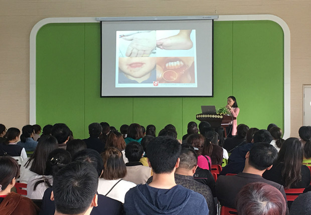 宋医生利用通俗、简洁、精辟的语言,结合事例形象直观的讲解了秋冬季常见呼吸道传染病:手足口、水痘、麻疹等的传播途径、常见症状、预防方法及疾病护理知识。重点介绍了通过提高饮食质量、养成良好的个人卫生习惯、加强个人防护、免疫预防等多方途径进行秋季传染病的防治;并请家长配合幼儿园做好传染病的管理,坚持晨检,密切注意孩子的的身体情况,及时发现传染病疑似病例,做到“早发现、早隔离、早治疗”。随后宋医生还介绍了出现传染病后的处理和报告,并提醒家长及时为孩子注射相关疫苗。