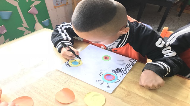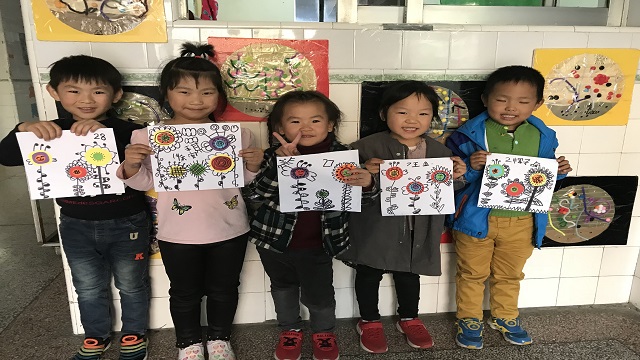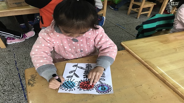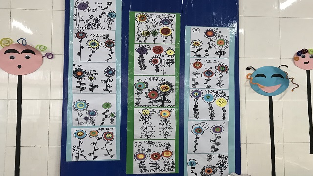 孩子们先找来各种颜色的彩纸和剪刀,将它们剪成大大小小的圆形,再用胶水按从大到小的顺序粘在纸上,孩子们说这样就可以用来做花心啦。结合我园最近开展的美术特色活动——线描画,孩子们拿来黑色水彩笔,开始认认真真地给花心添上各种形状的花瓣儿,各种形状的花茎,还有各种花纹的叶子。有的孩子甚至还给花朵添上了炯炯有神的大眼睛,一朵朵鲜花变得活灵活现,好像在弯着腰、点着头对小朋友说“谢谢”。没过一会儿,各种各样的花朵都跃然纸上,孩子们用鼻子闻一闻,都说香味扑鼻;用耳朵听听,都说花朵儿正在努力开放;用手摸一摸,都觉得花瓣儿软绵绵的,摸上去很舒服。最后我们将孩子的作品陈列出来,孩子们都说:“这个冬天,我们也有花儿陪伴了!”