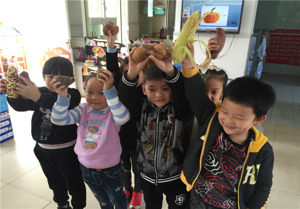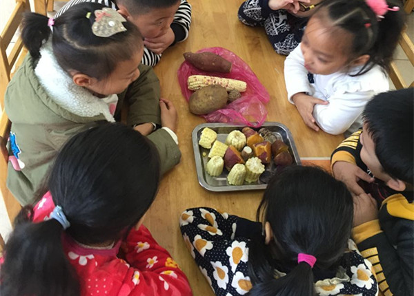 拿到老师一早准备好的玉米棒子,不少小朋友犯了难。虽然认出了这是玉米,可它们怎么还穿着好几层厚厚的“衣服”,顶上还有黄褐色的“胡须”?在老师的帮助下,小朋友们终于将玉米剥好了。剥完了玉米,老师又带小朋友认识了芋头、红薯、紫薯、南瓜、山药等粗粮。孩子们在日常生活中都有接触到这些粗粮,但是对于粗粮的营养价值还不是很了解,蒋老师给孩子们讲解了粗粮具有丰富的纤维素,有利于保障消化系统正常运行,多吃粗粮身体棒。