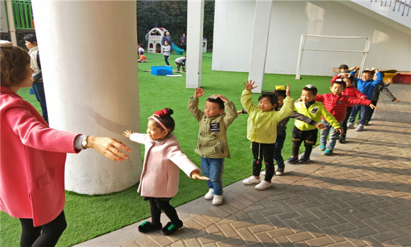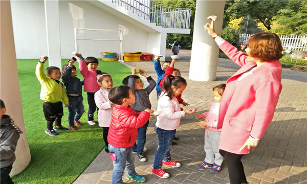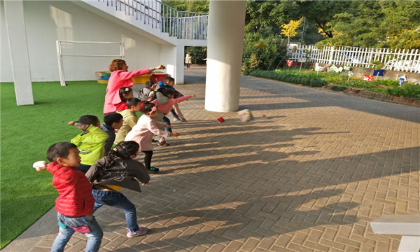 玩沙包是一种经久不衰的民间传统游戏,孩子们对沙包有着浓厚的兴趣,但对于中班孩子来说,缺少更多新颖有趣的玩法。就此,中班的老师就在户外活动时间,带领孩子们体验了一次“沙包乐”的活动。活动开始了,在老师的引导和帮助下,孩子们结伴自由探索沙包的各种玩法,有的运沙包,有的顶沙包,有的夹着跳,有的一根手指顶起沙包练习“一指禅”,下雨喽(朝上扔沙包)、打敌人(两个孩子你追我赶把沙包扔到对方身上)、投准(沙包投入地上的呼拉圈内)……一个一个游戏交换着进行,孩子们玩的不亦乐乎。