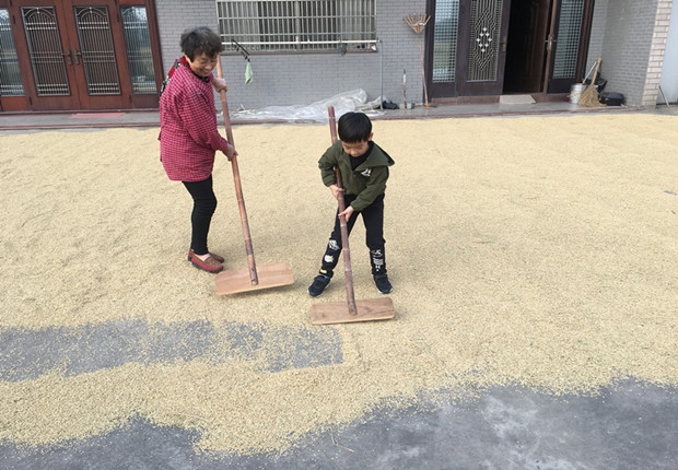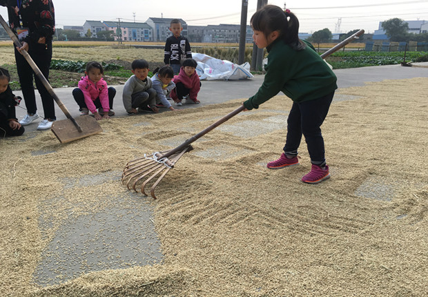 孩子们徒步来到幼儿园旁边的田野,一路上,一股股淡淡的野草的幽香扑鼻而来,水稻姐姐笑弯了腰。孩子们走进田间,近距离观察水稻,纷纷好奇地用手摸摸金黄的稻穗;他们在收割过后的田里拾起了稻穗;小伙伴们还跑进“稻谷场”,打量着地面上一粒一粒金灿灿的稻谷,叽叽喳喳地向正在翻稻谷的奶奶提着各种问题,奶奶让孩子们尝试体验了推稻子,翻稻谷的劳动过程。孩子们在实践中体验劳动的艰辛和收获的快乐,从形象具体的感知中获得了有关大米从哪里来的常识,体会“谁知盘中餐,粒粒皆辛苦”的深刻含义。