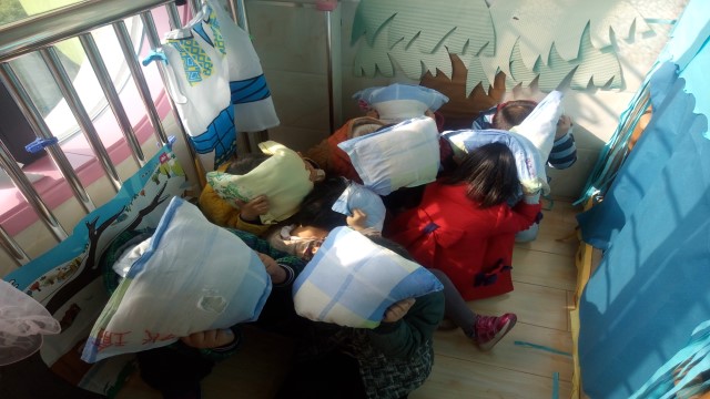 本次活动分为两部分,一防震知识教育。孩子们看图了解什么是地震,地震发生会导致什么情形。孩子们说:地震会让房子倒下来。思考:那么地震来了我们应该怎么办呢?有的孩子说可以躲在桌子下面,有的孩子说可以跑到楼下的空地上,有的孩子说可以躲在墙角……二实际防震演习。孩子们已经掌握了防震知识,待会就要就行防震演习了。老师大喊一声:地震啦。孩子们迅速躲到了桌子下、钢琴旁、墙角等较安全的地方,并用手保护头部。