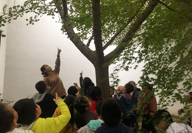 活动前教师组织幼儿认知银杏树,通过讲解银杏叶、树、果实等外部特征让孩子了解植物的生长习性、功效,丰富孩子的认知经验。