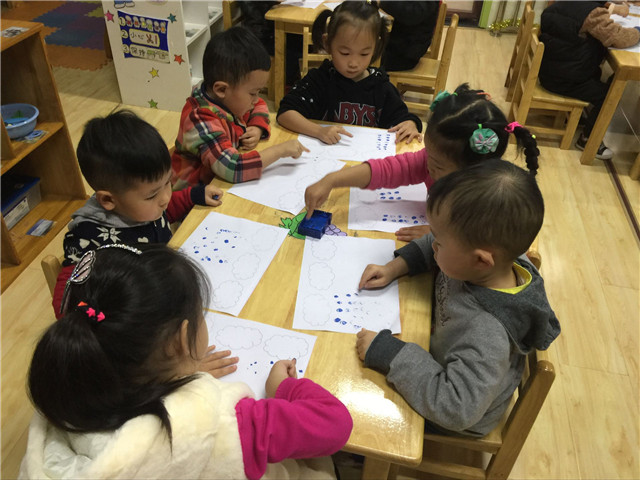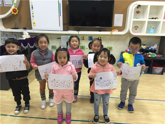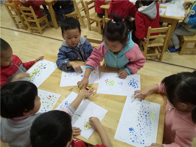 手指点画是指幼儿直接用手蘸取适当颜料,在纸上进行指印的艺术活动,是幼儿绘画活动中常见的一种形式,为改善小班幼儿手臂的小肌肉发育不够完善的问题,丽华第二幼儿园小一班开展了美术活动——手指点画《彩色的小雨滴》。