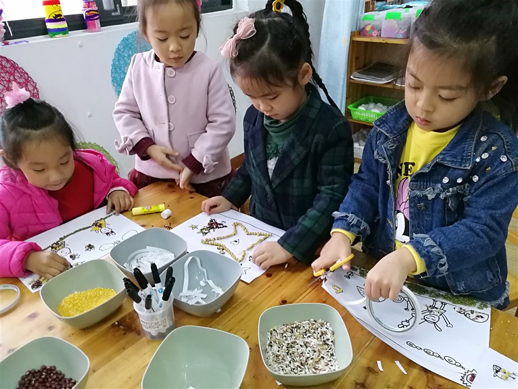 种子画让孩子们认识各种粮食的同时,也促进了孩子们的想象、动手、协调能力的提高,使孩子们动静结合,而且还进一步促进孩子们养成爱劳动、珍惜粮食的美好品德,让孩子们对大自然心生敬畏之心、对劳动人民心存感恩之心。
