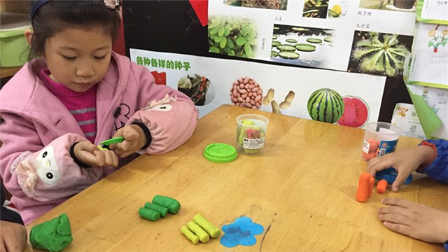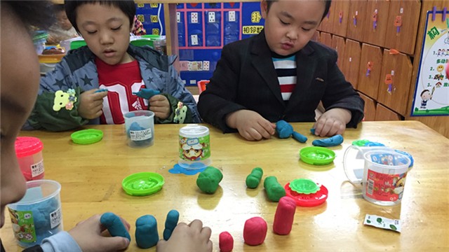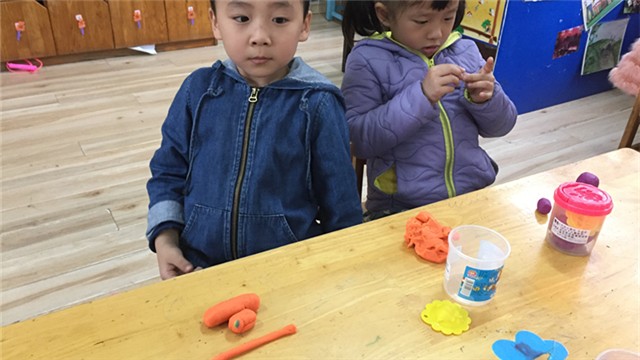 因为通过了木质积木的排列,大部分孩子已经对粗细有了直观认识,现在用他们熟悉的陶泥自己来做圆柱体,个个兴趣满满。同组间的幼儿还会互助、交流、比较。很好的达成了本次活动的目标。