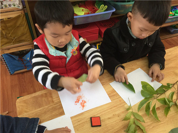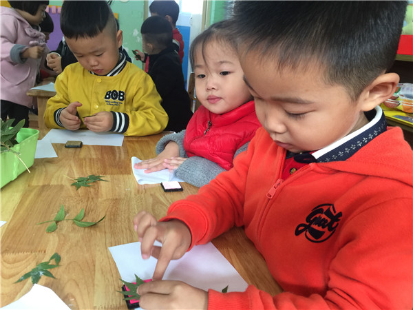 通过这个活动孩子们不仅学会了拓印的基本方法,还探索了各种树叶的粗细、长短、大小及颜色等奥秘,在有趣的活动中学到了许多知识。