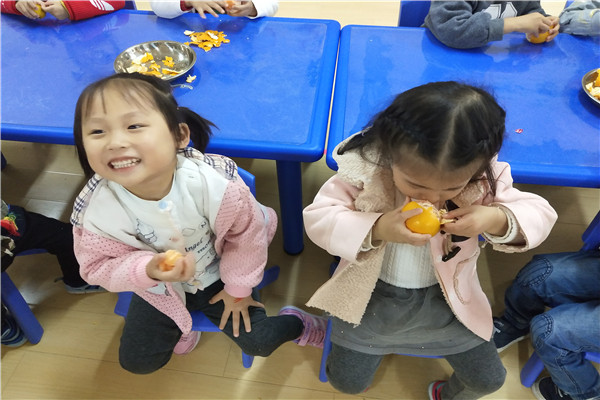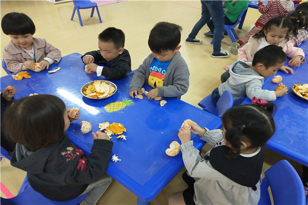 活动开始啦,老师准备了一个神秘的魔盒,将橘子藏在魔盒中,用变魔术的方式激发幼儿的兴趣。接着老师调动幼儿所有的感官全方位地来认识橘子:小眼看一看,橘子的颜色和外形特征;小鼻子闻一闻,记住橘子独特的香味;小手剥一剥,感觉橘子皮与皮肤的亲密接触;小嘴尝一尝,享受橘子酸酸甜甜的味道。另外老师还给幼儿讲解了橘子的营养价值和吃橘子的禁忌。