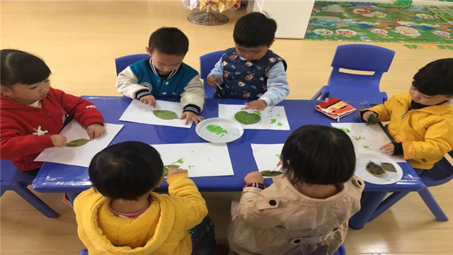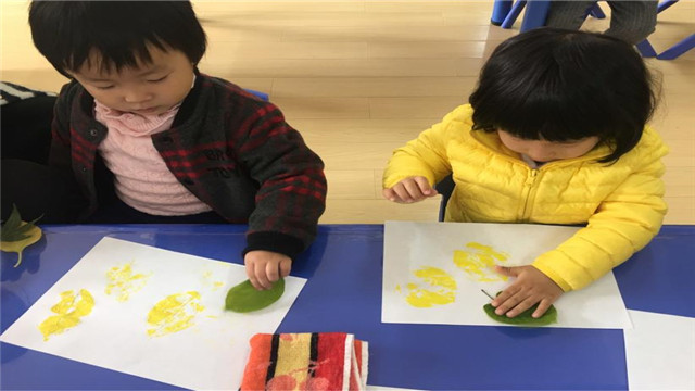 随着天气的变化,树叶一片一片从树上飘下来的时候,幼儿对此发生了非常浓厚的兴趣,有的说树叶在跳舞,有的说树叶在唱歌,大家纷纷捡起了地上的树叶看一看,跟它说说悄悄话。2017年11月15日上午,香溢紫郡幼儿园幼幼班的老师利用这一教育契机,将树叶作为拓印的材料,开展了“有趣的树叶拓印画”活动。
