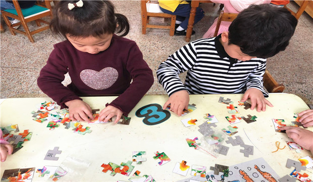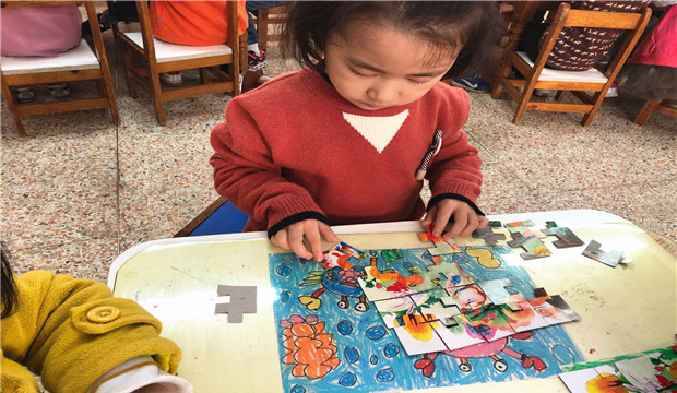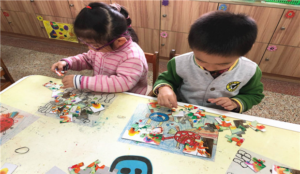 拼图游戏是需要幼儿有足够耐心、观察分析能力和手眼协调配合的过程。幼儿在玩拼图游戏时,要将一堆凌乱的、不规则的图片拼成一幅完整的图案,需要调动手眼的协调,需要通过大脑的思考,将一块块图案根据图案的色彩、图形进行对比,然后尝试拼接,在这个过程中,幼儿的小肌肉的技能得到锻炼,如:抓、镶嵌等多种技能,我们经常看到在幼儿拼图游戏时,不时地在选择图片,这是一个抓-放-镶嵌的过程,在这一过程中幼儿的小肌肉得到锻炼。拼图游戏进程中,语言自始至终地伴随活动进行,拼图游戏为幼儿提供了语言实践的良好机会。在拼图过程中,我发现,当一个幼儿拼图出现困难时,经常会得到其他幼儿的帮助,他们会很热心的帮助寻找、拼接,在帮助同伴的同时不仅自己获得满足感和成功的体验,也在无形中学会了与人合作、友好相处、分享、乐于助人等多种社会技能和良好的道德品质。