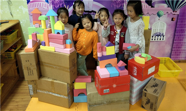 在开放的建构环境中,孩子们不仅创意出了高楼、火车、马路、迷宫、圣诞树等各种造型,而且潜移默化地学会珍惜、热爱环保,体现出“游戏中学习、快乐中成长”这一育人理念。(发文者:沈丹)