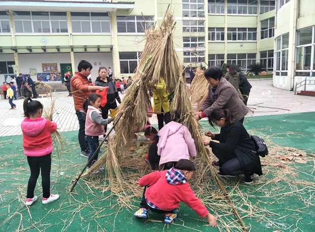 活动中,幼儿在老师的带领下来到了各自的游戏区域,大一班在大操场的地砖区域进行“创意树屋”的搭建,大四班在大操场的绿塑地带里进行着“种子集合”的游戏,大二班足球场的外围地域开始了“南瓜大变身”的体验,大三班则是在户外娃娃家建构区域进行“树叶树叶别样美”的创意拼贴。在游戏开始前,各班教师向幼儿介绍了秋收游戏体验的活动要求,随后,孩子们便迫不及待地开始了他(她)们忙碌的身影,有的捡树叶、扎稻草、扶竹子、穿树叶,有的跟着爸爸妈妈一起挖南瓜里的籽儿,家长带着孩子,兴奋地粘贴着一颗一颗的种子;扎着一小堆儿小堆儿的稻草,鞋子脏了,衣服挂上稻草屑了,一片片的落叶在孩子和家长们的手中成了宝贝了,配上原木色的纸板做底板,不一会儿,一只秋虫、一艘小帆船、一张张漂亮的脸蛋……一座座草屋、一幅幅树叶拼贴、一个个活灵活现的小动物,一张张生动的南瓜造型,就这样灵动若现的出来了!