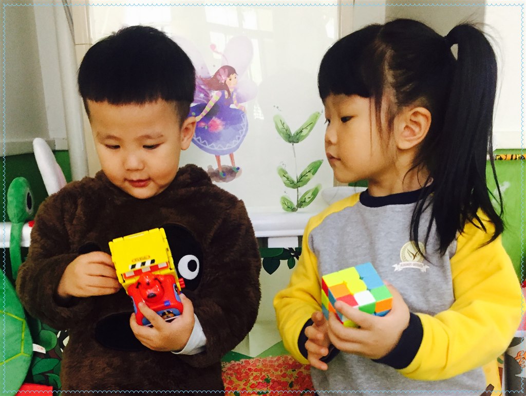 今天教学的第一环节的设计是展示玩具,主要是孩子介绍自己的玩具及玩法。第二环节的设计是给玩具分类,孩子能把各个不同的玩具分别放入筐内,并会给它们的家取名,这个叫积木家,汽车家,动物家,娃娃家 …… 第三个环节是学会与同伴“分享玩具”。为使幼儿的分享行为能够持续不断地进行下去,我给孩子们建立的“分享规则”平等分享,共同分享,轮流分享。今天和孩子们一起讨论:“当别人把自己的玩具给你玩时,你是不是很高兴?如果不给你玩,你是不是很难过?”让幼儿通过情感换位来体会,感受别人的心理,并学会站在别人的角度来思考问题,从而建立起平等分享。