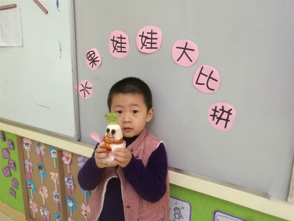 种类繁多的蔬果,通过家长和孩子们巧妙的构思、精心的创作,变成了各种各样可爱、漂亮的“蔬果娃娃”——用茄子制作的“企鹅”;用白萝卜组合制作了“雪人”;用橘子、苹果组合制作的“娃娃”。每件作品都别具匠心。通过此次活动,每一位幼儿都得到了不同的发展。胆怯的宝宝们在大家的鼓励下都勇敢、大胆地介绍了自己的水果娃娃,平时不善表达的宝宝们在闲暇时都会聚在自然角相互看看、说说自己的水果娃娃。