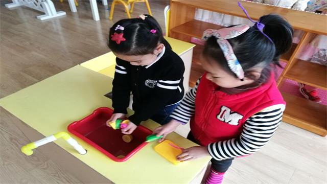 游戏开始了,在娃娃家里有的做“爸爸”,有的做“妈妈”,孩子们认真、投入地扮演着各种角色。爸爸在厨房间炒菜,哥哥在帮忙;“妈妈”则忙碌着,一会儿喂娃娃,一会儿洗菜、切菜,一会儿打扮自己准备出门;突然姐姐叫了起来:“啊呀,宝宝尿床啦!妈妈你快来呀。”……