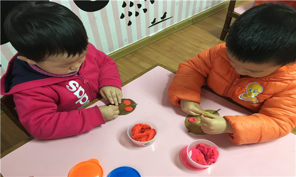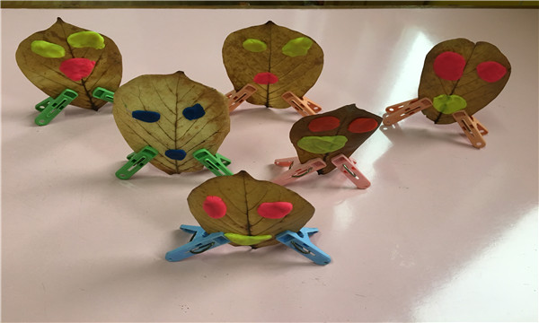 活动中,老师带着宝宝们一起到大自然中观察落叶飞舞的姿态,一起捡树叶。老师把捡来的树叶放到区域中,启发宝宝用橡皮泥帮树叶宝宝粘贴眼睛、嘴巴,宝宝们用灵巧的小手粘贴出了一个个可爱的树叶宝宝,开心地与树叶宝宝做朋友。
