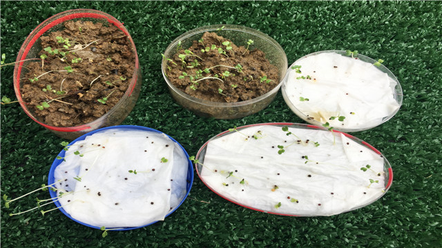 老师找来了2个塑料盒子,将两个盖子拿下做水培的器皿,盒子做土培的器皿。小朋友们将餐巾纸垫在盖子里,再倒上水,水要充满整个盖子。接着小朋友们又将剩下的盒子装满图,将同样的青菜种子撒在水培和土培的盒内,下面就期待着种子发芽啦!
