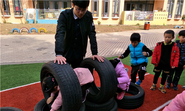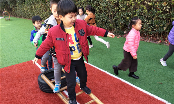 快乐的一天就这样在趣味的运动中开始了,孩子们时而钻、时而跳、时而踩高跷,玩得不亦乐乎。有的用轮胎搭建了一个个山洞,有的用梯子架起了桥,还有的把小椅子和箱子进行了组合。在老师科学合理的组织和调控下,孩子们得到了积极有效的锻炼。