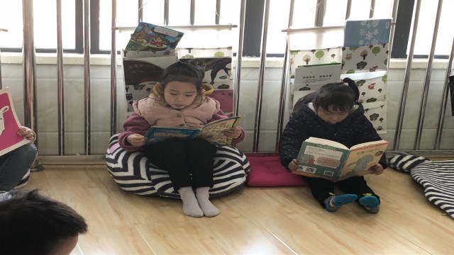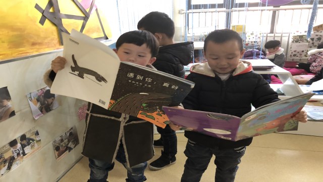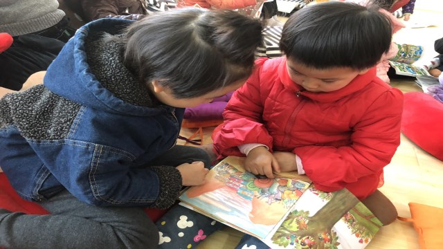 因此丽华二幼的老师们带领孩子们走进环境温馨的阅览室,让幼儿或是两两分享阅读、或是自己选择绘本。