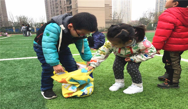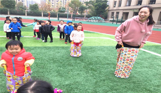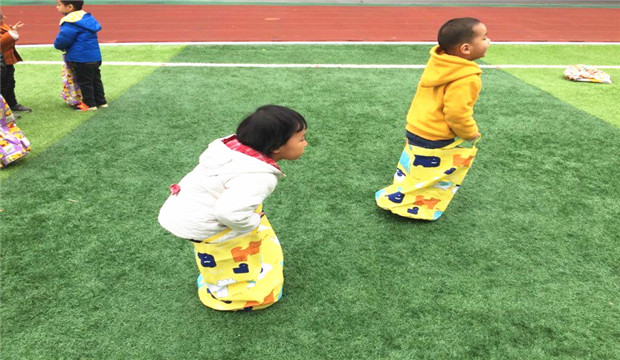 游戏开始后,第一个人必须迅速的把袋子套在腿上,然后提着袋子,像袋鼠一样跳向终点的小朋友;孩子们一个个变身成活泼可爱的小袋鼠,奋力向前,后面啦啦队的加油声此起彼伏。连老师也加入了跳跃袋鼠的行列,与小袋鼠们角逐……大家的欢笑声围绕在身边,孩子们享受着游戏的快乐!(张薇)