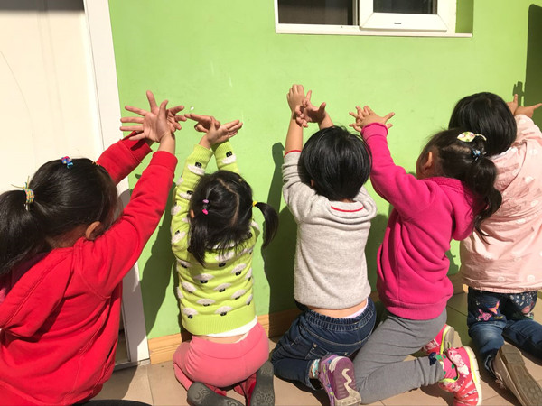 跑出了汗,坐在阳光下休憩,孩子发现了手影游戏的趣味,你做一个兔子,我做一个乌龟,哈哈,一起来表演个影子故事会吧。