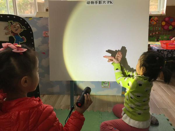 可是太阳宝宝也会有休息的时间呀,怎样把光线请进我们的班级呢,孩子们发现了有灯光就可玩游戏,于是 两个人合作,一个人打着手电,一个人做着各种有趣的手影,两个人就可以撑起一台戏呢,快来!快来!我们的手影剧场开场啦!