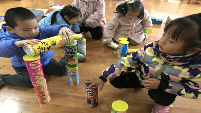 游戏开展前,我们一起收集了各种废旧物品,奶粉罐、薯片桶、鞋盒、纸杯等,利用散步的时间参观了幼儿园环境。游戏中,孩子们将自己已有的生活经验通过作品进行了生动的呈现。瞧:漂亮的幼儿园大门、园内的教学大楼、跑道、种植园地、滑滑梯等都在孩子灵巧的手中变出来。建构过程中,孩子们通过语言的交流进行合作,不断丰富着主题内容,运用了平铺、延长、接插、垒高、对称、围合盖顶等方法,体验到自己与同伴共同搭建的快乐感、成功感。