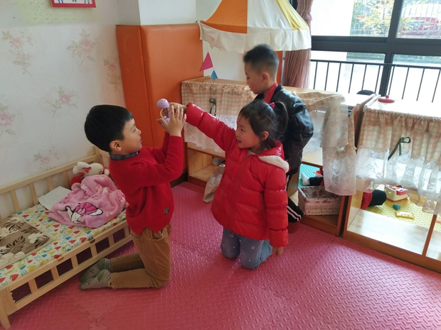 走进娃娃家,孩子们要先与同伴协商各自的角色扮演,然后走进化妆间为自己的角色打扮一番,紧接着孩子们要根据娃娃家全家福上人数选择相应的家。活动中,孩子们可“忙”了,一会儿給“宝贝”们穿衣服;一会儿给“宝贝”们洗头;一会儿给“宝贝”们讲故事;更有的孩子们还相互“串门交流”。那场面要多热闹有多热闹。孩子们在娃娃家玩的都舍不得出来了呢!