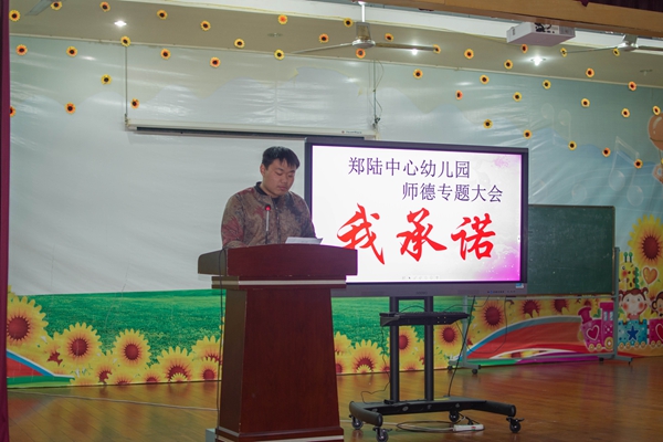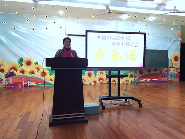 师德是教师必备的基本道德素养和职业要求,是一种具有感染力的品行,是一种自觉内化的高尚情感。为强化师德教育,全面提高教师职业道德水平,2017年12月6日下午,天宁区郑陆中心幼儿园展开了“我承诺”师德大会,会议由陆建芬副园长主持,全体教职工参与。