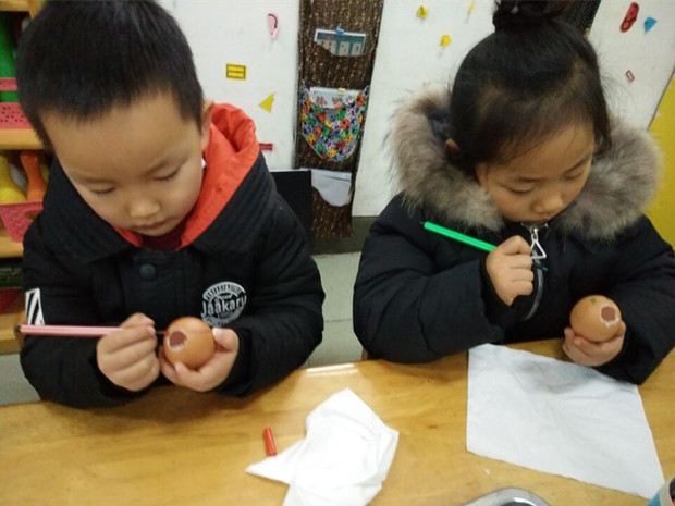 活动开始,孩子们和老师共同讨论如何绘制彩蛋,孩子们各自说出了自己的绘制构思,并提出了作画时的规则,如:小心保护蛋壳,不让蛋壳破碎;绘画时要保持安静等。孩子们用五彩的画笔在一个个蛋壳上画出阳光的笑脸和可爱的图案,并用彩色的剪纸点缀修饰自己的鸡蛋。最后,当一个个绘制好的五彩蛋呈现在蛋托上时,孩子们露出了欣喜的笑容,久久不愿离开。