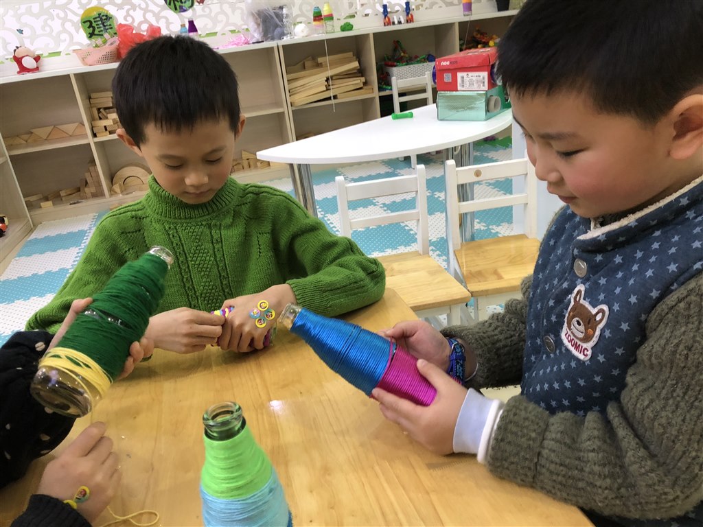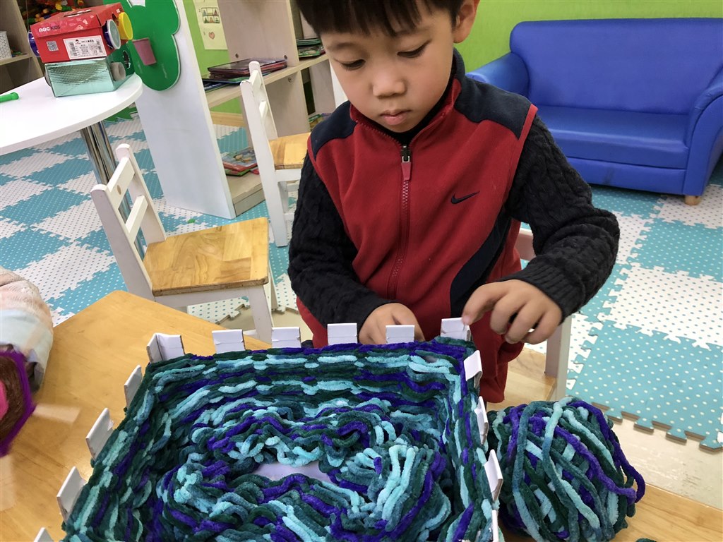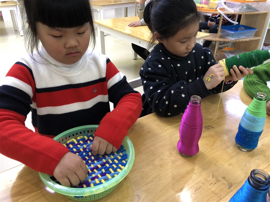 孩子们在老师和家长们的指导下学会用毛线、呢绒丝、麻绳、彩带等练习简单的结、辫、捻、搓、拧、串、盘等多种编织技法,开始或以教师示范幼儿模仿,或教师和孩子一起创作、或在家进行亲子编织,到如今提供相关范例作品观察制作,有时也让孩子看分解图示自己摸索,直到幼儿学会独立操作。