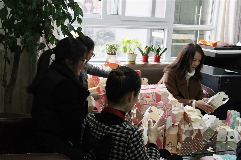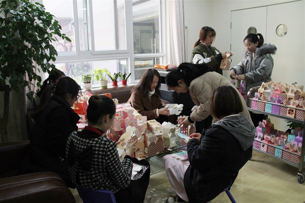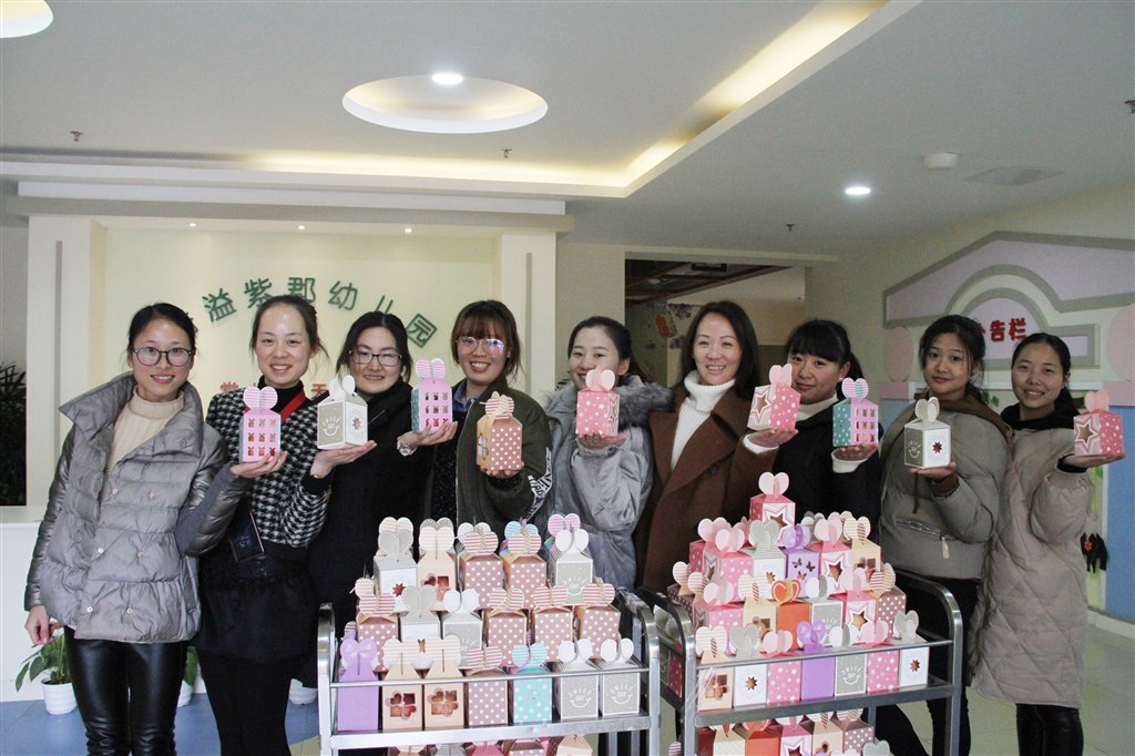 中午老师利用孩子们午睡时间,在缪洁园长的带领下围坐一起为孩子们精心准备礼物。老师们小心翼翼地将一个个平安果放到温馨的礼盒中,为了让盒子的底部稳稳地托住苹果,老师们还对盒子底部进行加固。其实,装到盒子里的不仅仅是苹果,更是老师们的心意和祝福。