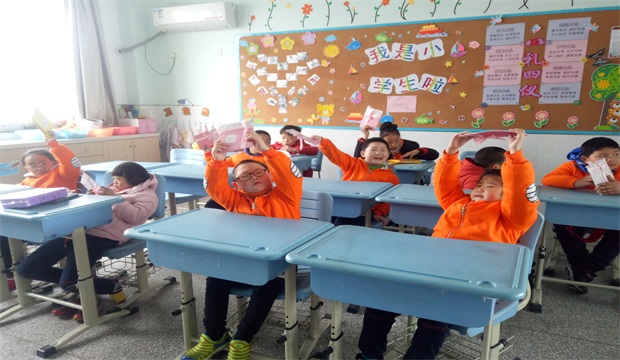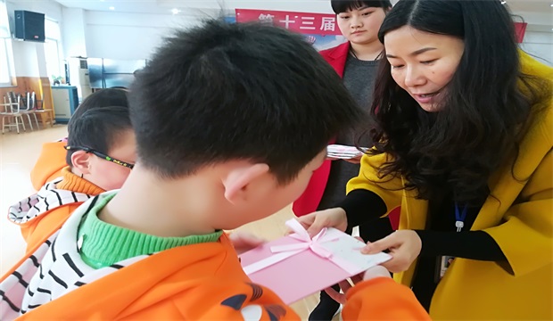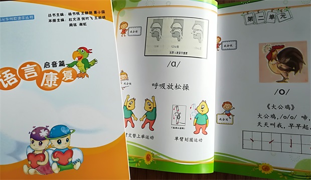 “语言康复”手掌书是江苏省教育科学“十二五”规划2015年度重点自筹课题《培智学校低学段语言康复校本课程开发研究》的研究成果之一;是光华学校针对培智低学段学生普遍存在语言障碍问题开发的校本课程读本。旨在帮助孩子矫治发音、积累词语、规范句式,提高语言表达综合能力。经过两年的努力,“语言康复启音篇”编写完成,并制作印刷出来作为新学期礼物送给一年级小朋友。 2018年3月5日的升旗仪式上,王校长为13位一年级小朋友亲手送上包装精美的手掌书“语言康复启音篇”。孩子们开心地接过这份珍贵的礼物,回到教室立即翻看起来,小小的手指点在图片上,辨认着每一个图案,读着认识的汉字。虽然口齿含糊不清,但个个兴致盎然。