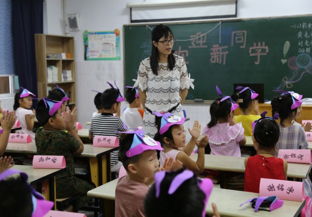 清晨,当小朋友们迈着轻快的步伐,洋溢着快乐的笑容,踏进校园。迎接他们的学姐学哥为他们戴上彩虹兔或小龙人头饰,可爱的新同学们随着可爱的图案寻找到了自己的班级。王校长、茆校长在门口热情地欢迎每一个孩子,老师们在教室耐心地等待着。班主任亲手给孩子们戴上漂亮的胸卡,孩子们戴上了属于自己的“名牌”,可神气了!瞧,他们自信大方地走进了属于自己的教室,坐在属于自己的课桌上,心中充满了自豪。一年级各班语数老师精心准备,亲自示范,耐心指导小朋友们如何排队,学习课堂规范小儿歌等。在老师激情四射的讲解下,小朋友学习热情高涨,一张张小脸荡漾着甜美的笑容。