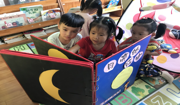 晨间活动、区域游戏时间、自主游戏时间孩子们都喜欢钻到阅读区的小角落里,选择自己舒服的阅读方式、姿势来自由阅读。拿到自己喜欢的书籍,孩子们就静坐在那里,观赏在书的海洋里。有的坐在小沙发上独自阅读,有的几个孩子一起围着老师制作的大书边看边讲,老师也适时地鼓励幼儿相互交流,使他们在相对自由的环境中学习阅读,相互感染、相互启发,分享快乐,从而提高他们参与阅读的积极性。