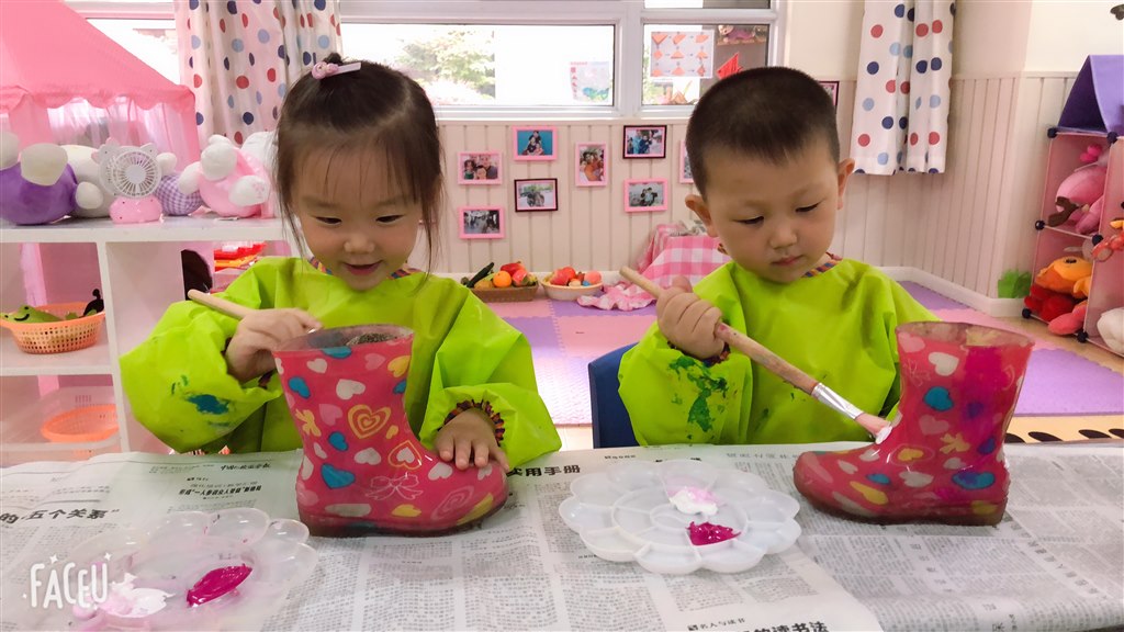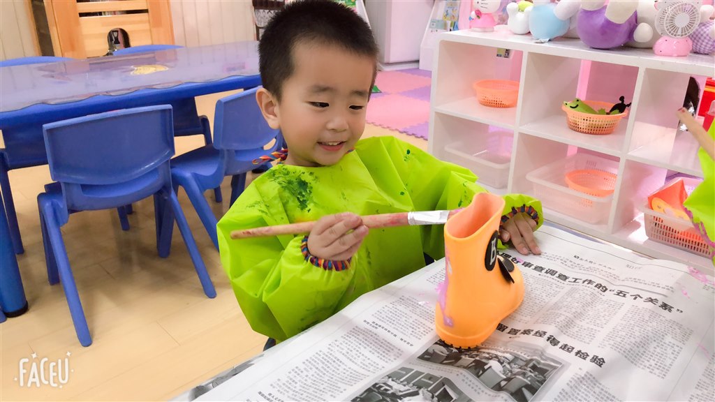 每个班级的植物角都各有特色,这次,欢迎你来我们小三班来望一望。小雨鞋旧了、穿不下了,怎么办?不扔不送,开动我们的小脑筋,动动我们的小巧手,我们来次雨鞋大改造,给它重新穿上好看的衣服。穿好包包衣,桌上铺好报纸,调色盘里挤上颜料。拿起小画笔。开始涂色了,我们涂色可认真啦,把小雨鞋涂成粉粉嫩嫩的粉红色,和我们班的Hello kitty风格很搭哟。