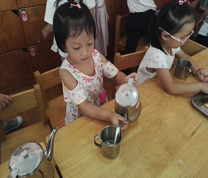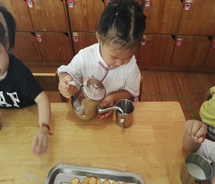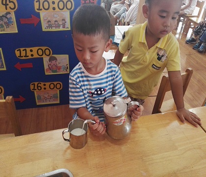 《指南》中指出,幼儿生活活动中应该培养的基本经验:学做自己的事情。对于小班孩子来说,学着自己用餐具是最基本的能力。让幼儿自主通过观察感知、练习操作,老师再作个别指导,如今孩子们基本已获得了初步的认识和正确使用的方法,瞧,他们正尝试着自己端小壶倒牛奶喝呢!真是能干极了。