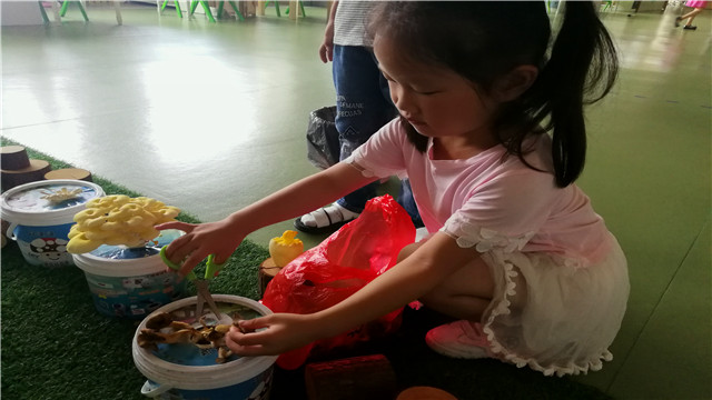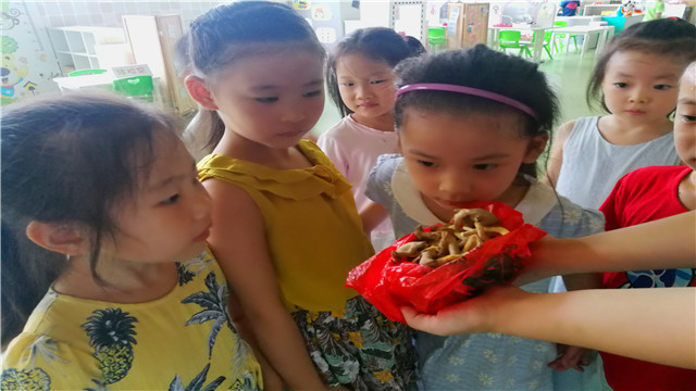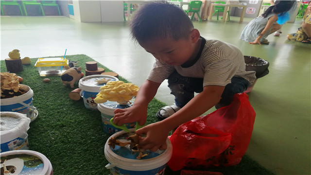 看到小蘑菇收获了,最高兴的还是孩子们,他们拍着手大声说:“太棒了!小蘑菇长大啦!”还有的小朋友悄悄对旁边的好朋友说:“咱们可以用他们来炖蘑菇汤了。”哈哈,那么咱们就来把蘑菇采下来吧!孩子们拿来小剪刀、方便袋,仔细地将蘑菇剪下,放进袋子,不一会儿,长成的蘑菇被孩子们采光了,真是收获满满!老师将装满蘑菇的袋子打开,孩子们蜂拥而上,看一看、摸一摸、闻一闻,近距离感受小蘑菇。这一过程增加了孩子们对大自然的热情,也增强了照顾植物的欲望,同时感受到了收获的喜悦。这正是我们创设自然角的初衷。