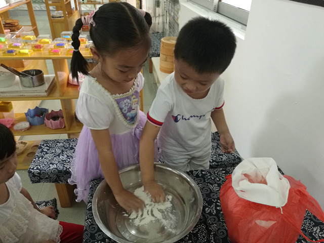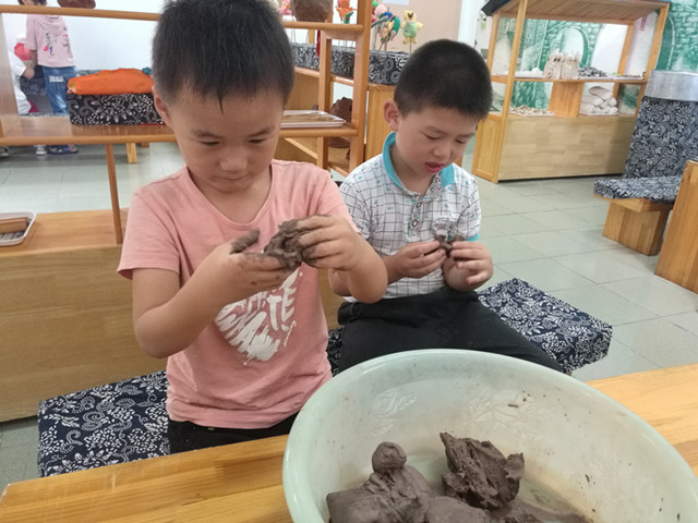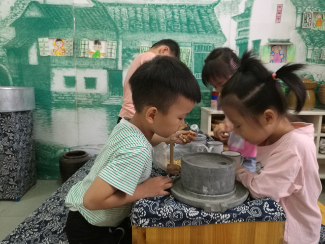 瞧,孩子们做的多带劲啊!磨豆浆:女孩、男孩默契的配合,体验用石磨来磨出香甜可口的豆浆,女孩放豆子,男孩出力气;做泥塑:男孩子们个个不怕脏,用湿软的陶泥做出自己想做的小飞机、小房子,还有小花瓶;做糕饼:孩子们把面粉加水揉成面团,用力把面团揉均匀。然后用面团和模具,做出一个个可爱有精巧的糕团;青花瓷:孩子们在自制的瓷瓶上,用勾线笔画出心中美丽的图案,然后涂上青花瓷特有的蓝色,别致又有意义。