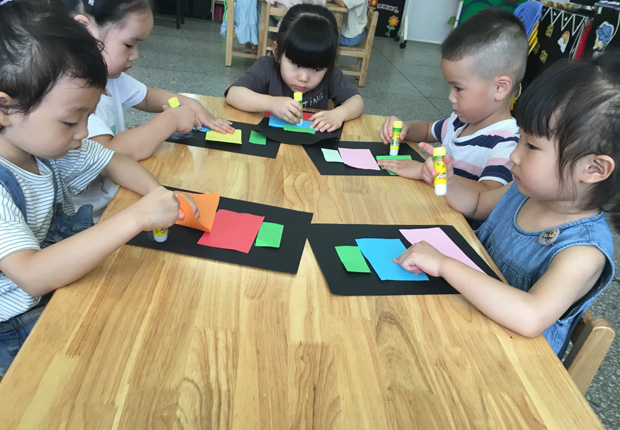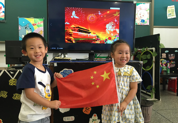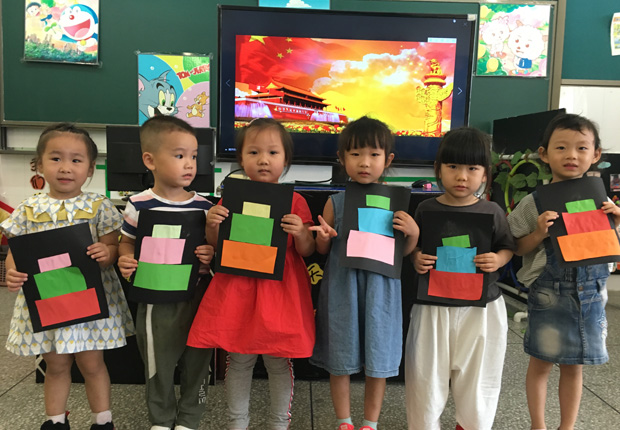 小班的小朋友年龄小,语言和行动的表达方式还不强,且由于自身的已有知识相对缺乏,只知道“过节了,我们可以玩了”。但是,北幼小班的老师们巧花心思设计了适合小班幼儿的活动。看!首先通过看和听对“国庆节”有了初步的认识,接着通过唱,上台表演了《我爱我的幼儿园》,唱出了新入园幼儿的独立、积极向上的一面,活动中充满着欢乐和喜悦。最后通过利用现有的材料,粘、撕、贴、印画,让他们动手参与到庆祝活动中,从中感受到节日的气氛。