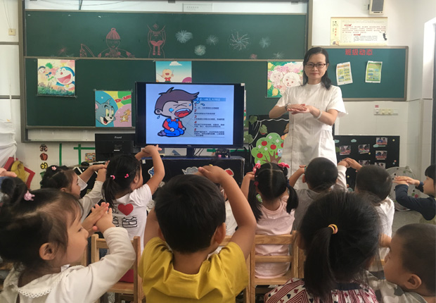 保健老师利用多幅图片从幼儿能理解的角度出发,普及了什么是手足口病,手足口病是如何传染的以及手足口病的预防和护理知识。教育儿童要勤洗手、不喝生水、不吃生冷食物,避免接触患病儿童,加强体育锻炼,注意膳食营养,提高自身免疫力。同时,还提醒家长注意保持家庭环境卫生,居室要经常通风,勤晒衣被,减少或避免携带儿童前往人群稠密场所,共同做好手足口病防治工作。另外,还告诫幼儿,一旦有发热,出疹的状况,要及时去就医并且告知老师。