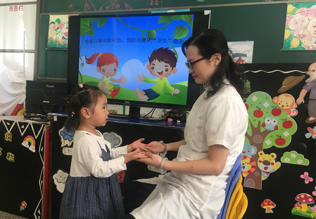 现阶段是手足口病的高发季节,为了让幼儿对手足口病有一定的认识,近日,北环幼儿园的保健老师来到小班年级,开展了“关爱儿童健康,预防手足口病”为主题的宣传活动,给老师和孩子们上了一堂生动而实用的防治宣教课程。