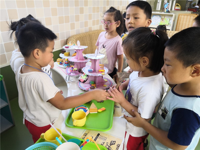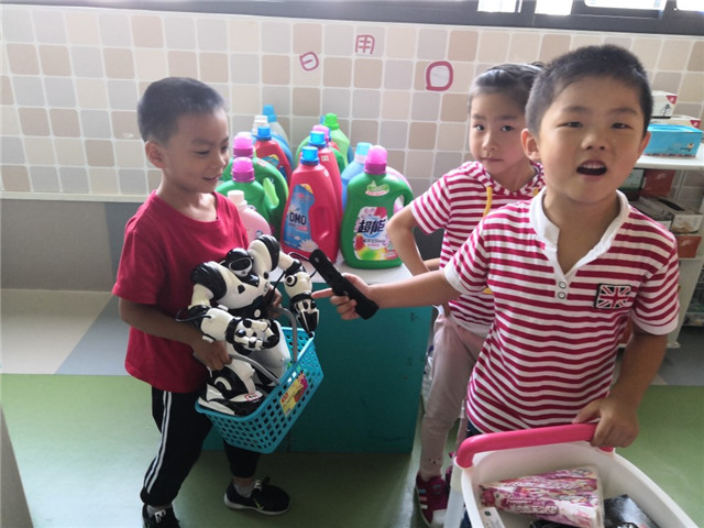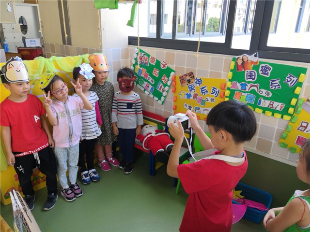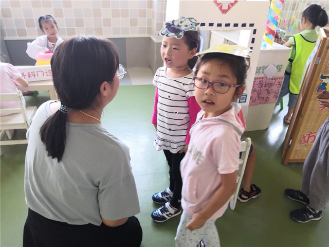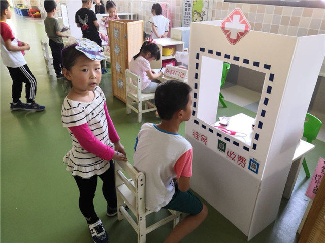 在游戏活动中,孩子们自由选择合适的材料进行有效合作,并在游戏中表现出来的全神贯注、超凡的想象和无法估量的创造性都令我们为之惊叹。在医院、烧烤、照相馆、舞台剧场等游戏活动中,老师们从幼儿的年龄特点出发,选择贴近幼儿生活的主题,充分利用废旧材料、家长资源为孩子制作了大量充足、精美逼真的游戏材料,合理利用边角、走廊、活动室的空间,为幼儿创设适宜的游戏环境。在老师创设的自由环境中孩子们玩得开心、投入,把自己的生活经验融入到游戏中,角色扮演得有模有样,在烧烤小吃店中,“老板、服务员”,舞台剧表演完的“小演员”们更是来到了照相馆合影留念,创造性游戏的联动就在孩子们的欢笑声中开展着......