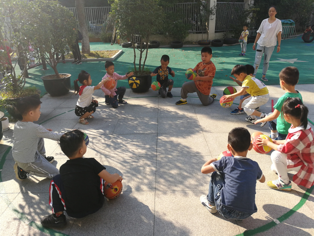 在拍球过程中,孩子们个个精神抖擞、精力集中,随着老师的口令进行练习。“老师,我和XX比赛,我赢了!”大班的孩子已经有了竞争意识,在竞争中学习,更能促进他们对体育活动的积极性。尤其是随着音乐的节奏,集体表演用皮球来玩游戏,小朋友个个动作灵敏、手脚协调,动作优美、玩法熟练,孩子们玩得愉快、尽兴、玩出花样、玩出聪明才智,充分激发了孩子对拍球活动的兴趣。