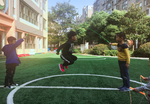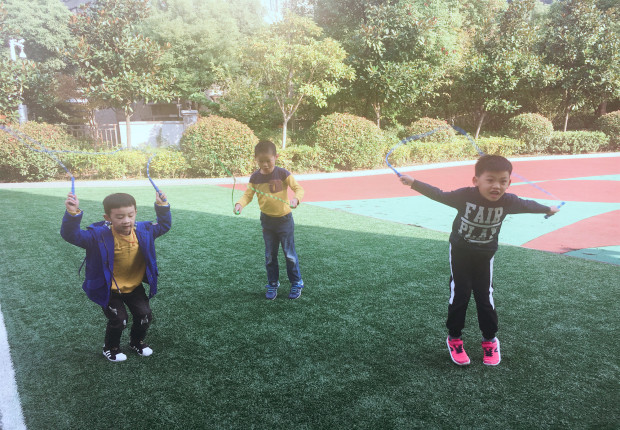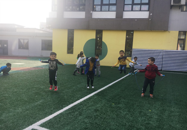 跳绳对幼儿来说是一种“快乐游戏”,是促进幼儿运动能力发展的活动之一。跳绳能促进儿童的身体机能、健康发育,提高幼儿手、脚、腕、肩等部位协调能力的发展。孩子们刚开始接触跳绳运动时会遇到许多困难,如:手脚不协调,绳子不是长就是短等。为了鼓励孩子积极参与跳绳运动,平日大家努力练习,相互鼓励,相互比拼,同时还利用家长资源,在家请爸爸妈妈陪伴孩子一起跳绳,激发幼儿跳绳的积极性。