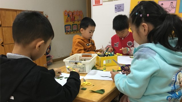 活动中,教师通过引导孩子观察树叶,说出各种不同形状树叶像什么,接着展开了一场“用树叶拼贴什么”、“如何进行拼贴”的大讨论,随后,孩子们拿起胶水、剪刀,以及黑笔,把收集来的各种树叶拼贴画出一幅幅精彩纷呈的作品,有“海底世界”、“幸福的一家人”、“蝴蝶花儿飞”……令人目不暇接。活动后,孩子们相互欣赏、点评彼此的作品,感慨大自然的神奇之处。