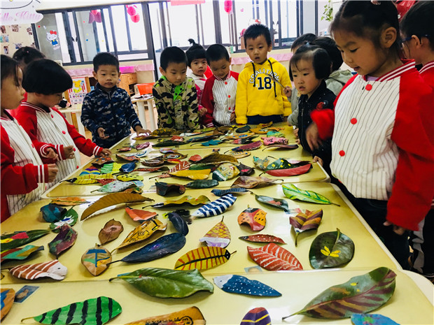 活动中,孩子们充分发挥自己的想象,通过自己稚嫩的小手和爸爸妈妈们在树叶上涂上美丽的图案。有色块分明的;有勾线动物图案的;还有把树叶剪成了一辆汽车......树叶上洋溢着纯真的童心童趣,大家都看着这些树叶不停地跟同伴一起讨论,别提多兴奋了!