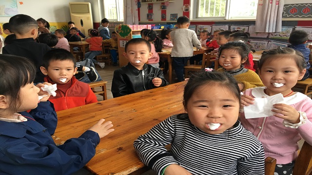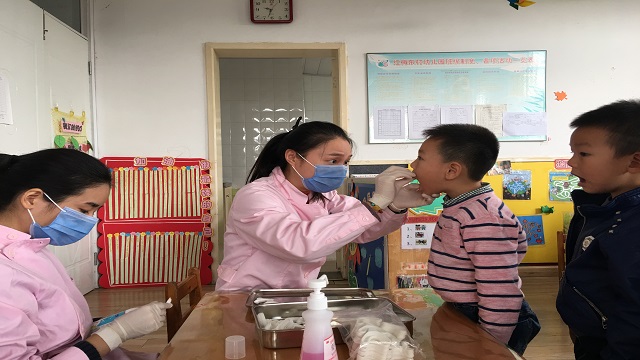 为了使孩子们有一口健康洁白的牙齿,10月25日上午,天宁区妇幼保健所的医生来红梅东村幼儿园开展氟化泡沫龋齿防治活动。在园保健老师的协调下,各班老师早作准备协助区儿保医生对孩子们进行了氟化泡沫龋齿预防。医生一边手拿沾有氟化泡沫的牙托,一边对孩子说:“小朋友,嘴巴张开,我把这个香香的好东西放在你的牙齿上,咬住3分钟,就不会长虫牙了噢!”医生们嘱咐各班老师孩子进行氟化泡沫龋齿防治后30分钟勿进食或饮水。孩子们不哭不闹,非常配合,个个争做护牙小卫士。